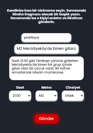 Kendinize bir takma ad seçin. Kısa ve rastgele bir şey. Başlık ve itiraf kısımlarını ise örnekte gösterildiği gibi kendinize uyarlayın. "Gönder" butonunun üstündeki kutularda ise yine o kişiyi seçiyorsunuz. Kendinizi değil.